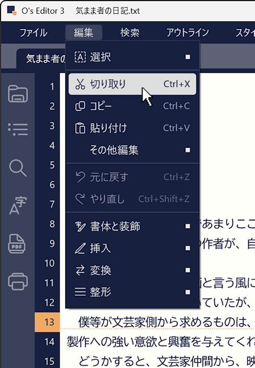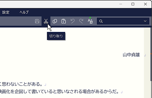 選択部分で削除するのではなく[切り取り]を行えば削除部分をクリップボードにコピーします。コピーした文字は別の部分に貼り付けることができます(※他のアプリにも貼り付け可能)。切り取りのショートカットキーは[CTRL]+[X]ですが、ツールバーのボタンや右クリックメニュー、メインメニューからも実行することが可能です。