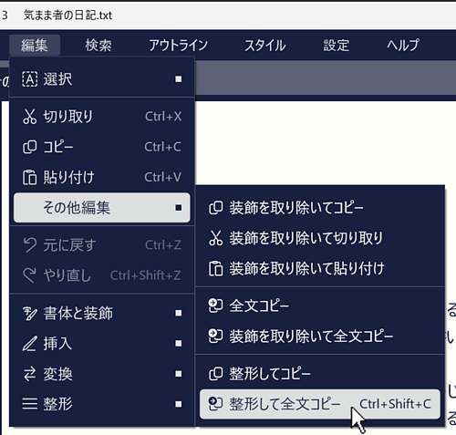 文字装飾が施された箇所をコピーした場合は、貼り付け時にも文字装飾が施されたまま貼り付けます。ただ、場合によっては装飾されていないプレーンなテキストを貼り付けたい場合があります。その時は[装飾を取り除いてコピー][装飾を取り除いて切り取り][装飾を取り除いて貼り付け][装飾を取り除いて全文コピー]を活用してください。
