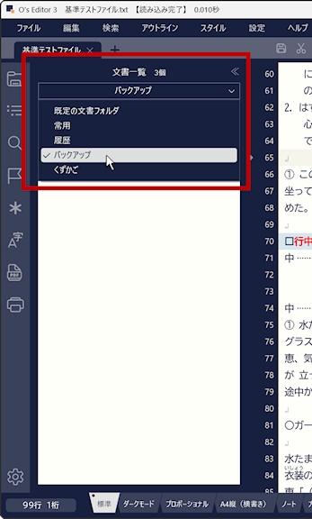 もちろんバックアップが万能なわけではありません。SSDが丸ごとダメになることも想定されます。文書フォルダを定的的に別ディスクへバックアップすることを忘れないでください。 さて、O's Editor3からバックアップファイルを開くのはとても簡単です。文書バーの上部にあるドロップメニューからバックアップを選んでください。