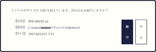 1GBを超える大きなテキストファイルを読み込むことは可能ですが、ファイルサイズが1GB以上のファイルを開くときに読み込みを続行するかどうか確認するためのダイアログが表示されます。