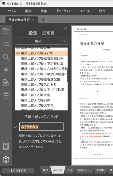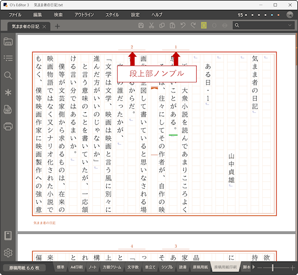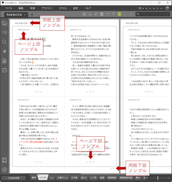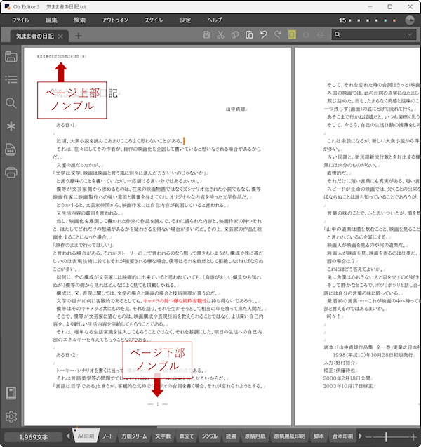 ノンブルとは本や雑誌などの印刷物でページの順序を示すページ番号のことです。O's Editor3 のノンブルはページの上部と下部に表示させることが可能です。ページ番号だけでなくファイル名や日付などさまざまな情報を表示することもできます。