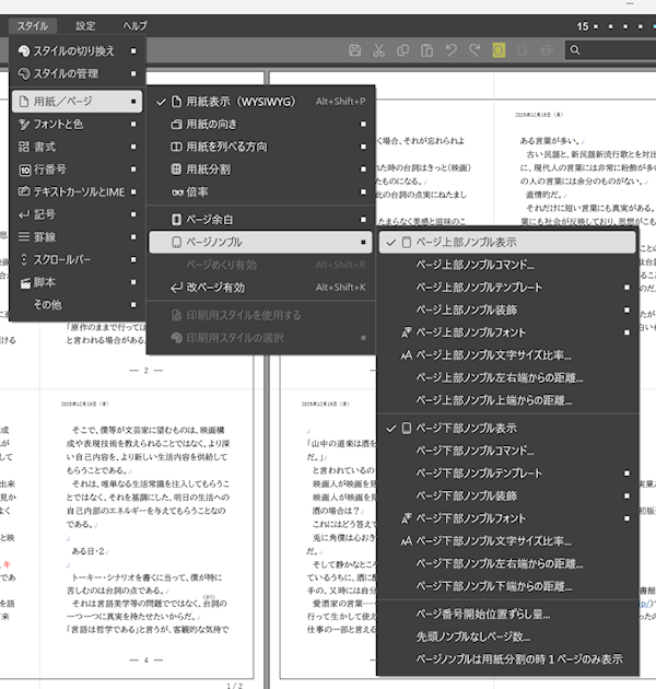 印刷用スタイルにはデフォルトでノンブルが設定されています。ノンブルの設定を変えるにはメインメニュー[スタイル|用紙/ページ|ページノンブル]で各種メニュー項目を実行してください。
