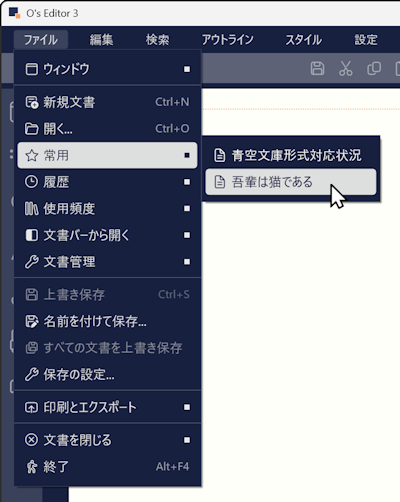 メインメニューのリストから文書を開くこともできます。例えば[ファイル|常用]は日頃良く使う文書を「常用文書」として登録することによってアクセスしやすくするためのメニューです。常用文書としての登録はメインメニューの [ファイル|文書管理|常用として登録]、あるいは文書タブの右クリックメニューで[常用設定|常用として登録]で行ってください。