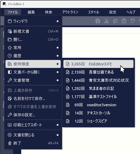 メインメニュー[ファイル|使用頻度]は過去に何回開いたかその回数順にリスト化したものです。よく使う文書を開くときに便利です。