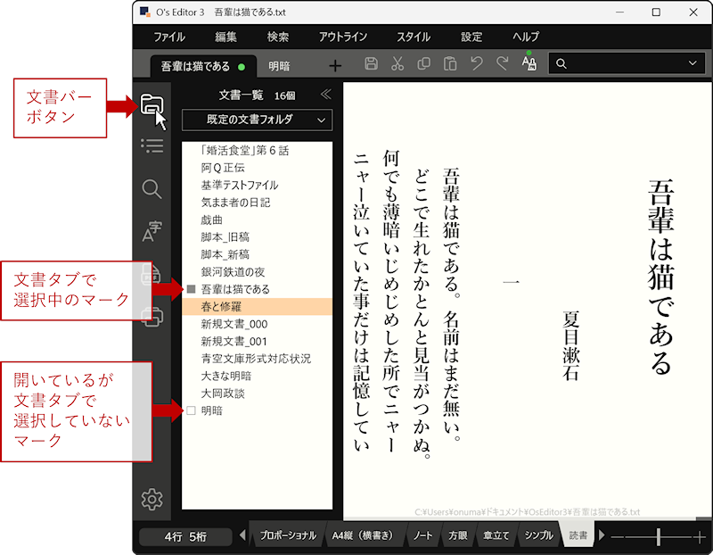アクションバーの一番上にあるボタンをクリックするとサイドバーの1つである文書バーが表示されます。文書バーは「規定の文書フォルダ」や「バックアップフォルダ」、あるいはユーザーによって設定されたフォルダなどを選択し、そのフォルダに含まれる文書を一覧したものです。ファイル名から拡張子を除いた名前がリスト化されていますのでダブルクリックすることで開くことができます。すでに開いているファイル名の先頭にはマーク表記が付加されます。