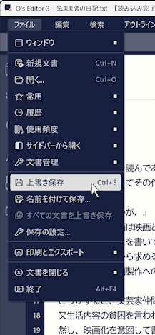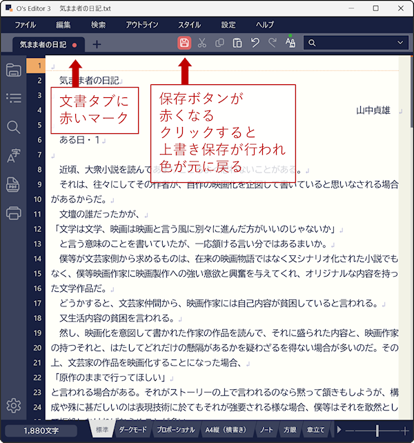 | 保存、大事です。特に〆切が迫った原稿をなんらかの事故で失ったときの喪失感はハンパないです。O's Editor3での保存は一般的なテキストエディタやワープロソフトと同じような感覚で行うことができますが、独自の機能もいくつか備えています。 文書に修正が加えられ保存する必要が生じると赤いマークが表示され、保存の必要があることを認識しやすくなっています。