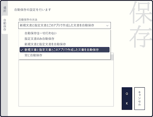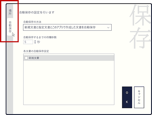 自動保存について解説します。自動保存は編集作業を行い文書に修正が施されてから一定時間(デフォルトでは5秒間)編集作業を行わないと自動的に文書を保存するというものです。自動保存を設定するには保存の設定ダイアログの左側の[自動保存]タブを選択してください。