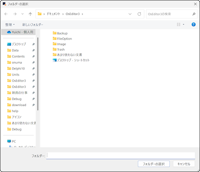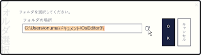 デフォルトで[規定の文書フォルダ]は C:\Users\(ユーザー名)\ドキュメント\OsEditor3\ となっていますが設定で変更することも可能です。メインメニューの[保存の設定]を実行してください。