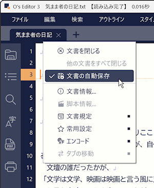 各文書の自動保存設定は文書タブの右クリックメニューからも設定可能です。自動保存が有効になるとチェックが入ります。