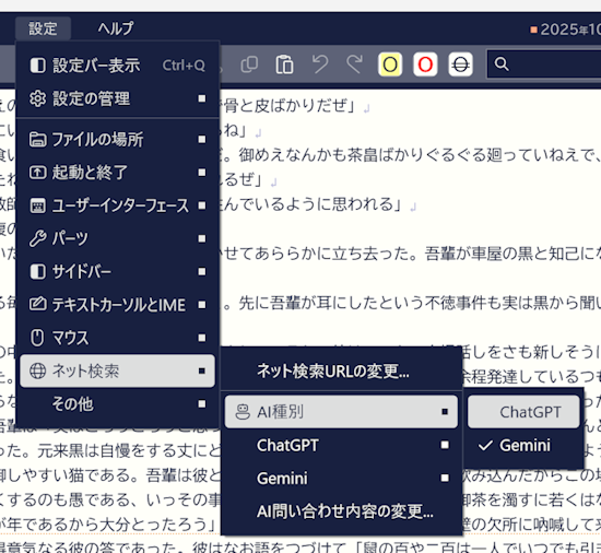 ChatGPTとGeminiの切り換えはメインメニュー[設定|ネット検索|AI種別]で行ってください。