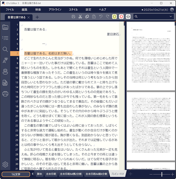 エディタを分割することも可能です。例えば[プレビュー付き]スタイルでは右側に印刷時のスタイルを同時に表示させることができます。