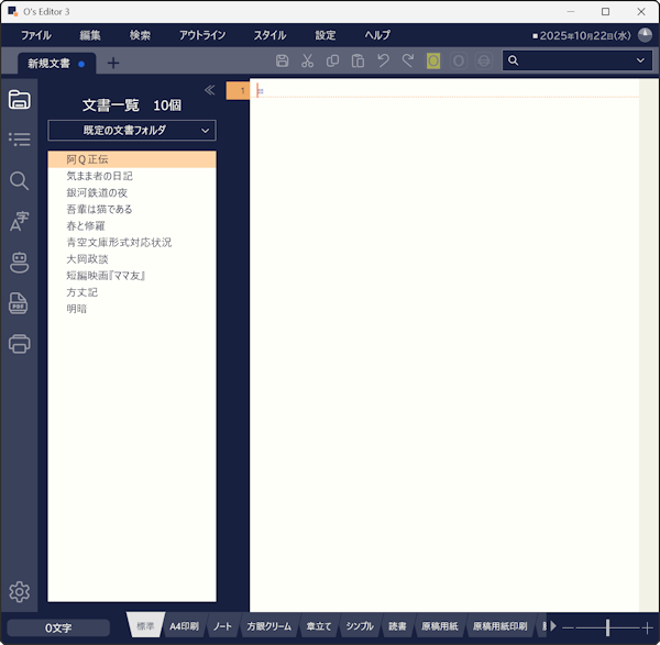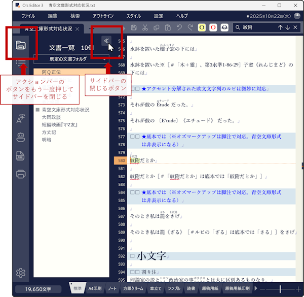 サイドバーは左側に表示されるアクションツールペインです。サイドバーは6種類あり、文書バー、アウトラインバー、検索バー、しおりバー、脚注バー、フォントバーとなっています。文書バーは既定の文書フォルダやバックアップフォルダ、あるいは独自に追加した良く使うフォルダなどからダブルクリック一発で文書を開くためのサイドバーです。文書を開く方法についてはこちらも参照してください。