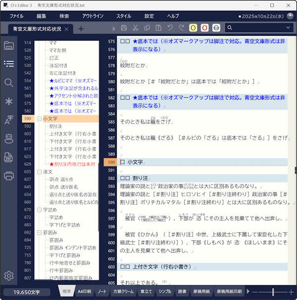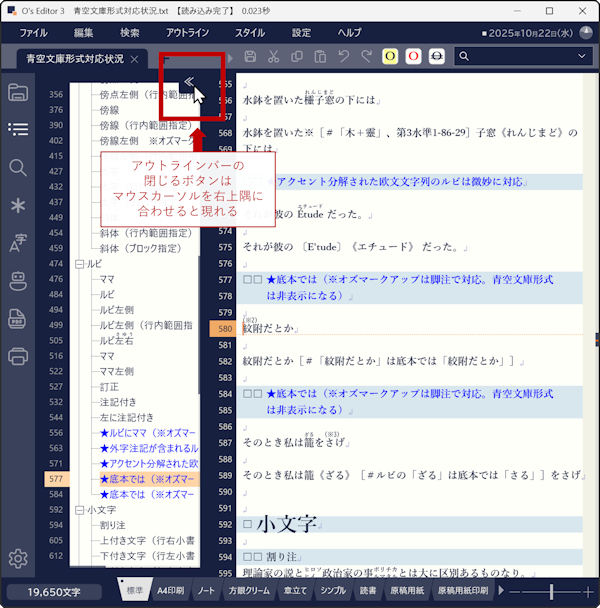 アウトラインバーは文書の見出しを解析したうえでツリー状に表示されるサイドバーです。クリックするだけでその見出しに飛ぶことができ、各ノード単位で場所を入れかるなどの操作も可能です。アウトラインバーの詳細はこちらをご覧ください。