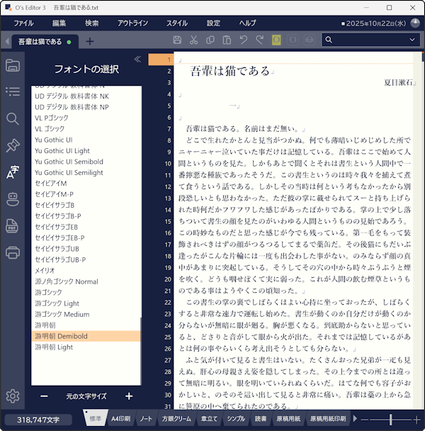 フォントバーはスタイルのフォントを変更するためのサイドバーです。一覧からフォントを選択すれば即座に反映されます。サイドバー下部には文字サイズを変更するためのボタンも備えています。なおフォントバーによるフォントの変更は、メインメニュー[スタイル|フォントと色|通常文字|通常文字のフォント]によるフォント変更と、[スタイル|フォントと色|通常文字|通常文字の文字サイズ]で文字サイズを変更することと同義で、スタイルの通常文字フォントを操作することになります。