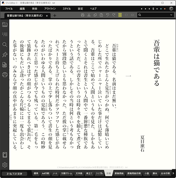 作者は小説界隈にはトンと疎いため、小説家が O's Editor3 を使うメリットについて語る資格はありません。ただ小説家が執筆にどのようなアプリを使用しているかについて書かれた雑誌の特集などを読むと、どうやら作家によって千差万別ということのようです。例えばベテラン作家などはいまだにワープロ(ソフトではなくハード)を使っていたり、本格的なワープロソフトではなくOSに標準装備されたメモ帳ソフトを使っている方も少なくないようです。つまり最も重要なのは“慣れ”ということですね。であれば O's Editor3 も慣れ次第で小説執筆に活用していただくのはアリということになりそうです。と無理矢理自分に言い聞かせたうえで、作者自身が O's Editor3 を小説執筆におすすめする理由をいくつかピックアップしたいと思います。