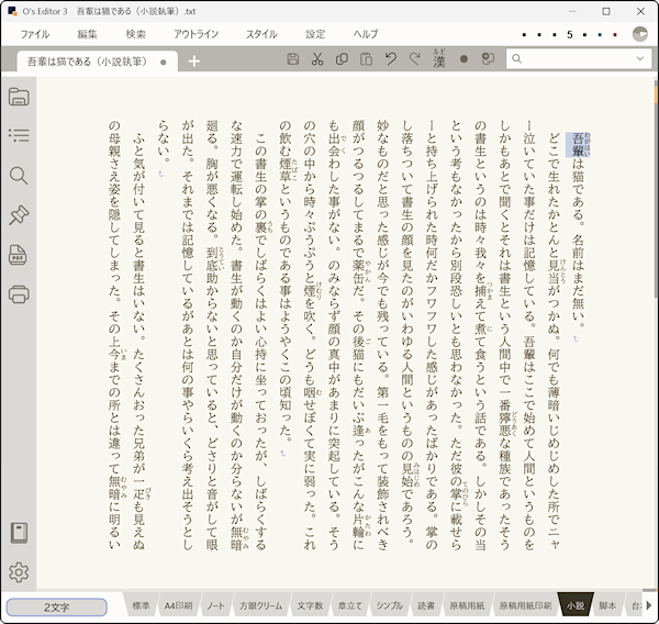 小説文では文字に装飾を施すケースは少ないのですが、ルビ(ふりがな)だけは頻繁に使用されています。完全に文字だけのデータであればテキストエディタで執筆することが1番快適だといえますが、一般的なテキストエディタはこの“ルビを振る”ということができません。小説を書く方にとっては致命的ともいえるでしょう。O's