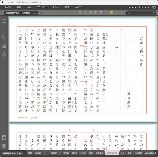 手書きの時代は皆思い思いの筆記用具で原稿用紙に文章を書いていました。デジタル時代になってもその文化の残照といえる原稿用紙スタイルは一定の需要があります。ただ、毎回原稿用紙スタイルで書きたいわけではない、という方も多いのではないでしょうか。そもそも小説のデータは文字のみですので、どのような体裁で執筆するか気分次第で変更できればなお良しです。O's