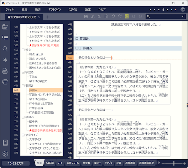 では1階層分の見出し一覧機能しか装備していませんでしたが、O's Editor3 では大幅に機能を強化し、階層に対応したツリー表示が可能になりました。見出しをクリックしてその本文の該当箇所にテキストカーソルを移動させるのはもちろんのこと、各ノード(章節項のひとかたまりの文章)の順番を入れ換えるといった章単位の編集機能も備えています。本文における見出し判別のための書式は文の先頭に四角形□を付加することがデフォルトになっていますが、もちろん自由に変更することが可能です。
