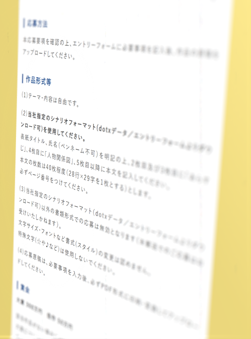 脚本コンクールの募集要項には必ず脚本の書式が明記されています。用紙1枚の行数、1行の文字数、そして字下げ(インデント)が主な規定項目となります。ひな形としてワードファイルが用意されている場合も多いのでそのワードファイルに直接脚本を書き込むことも可能ですが、書き込む度にインデントを変更する煩わしさがあります。O's