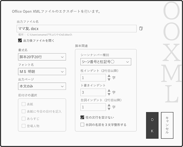 Office Open XMLエクスポートダイアログが表示されたら、各項目を選択します。例えば日テレシナリオコンテストの場合は書式名を[脚本20字20行]にして、フォント名は[MS