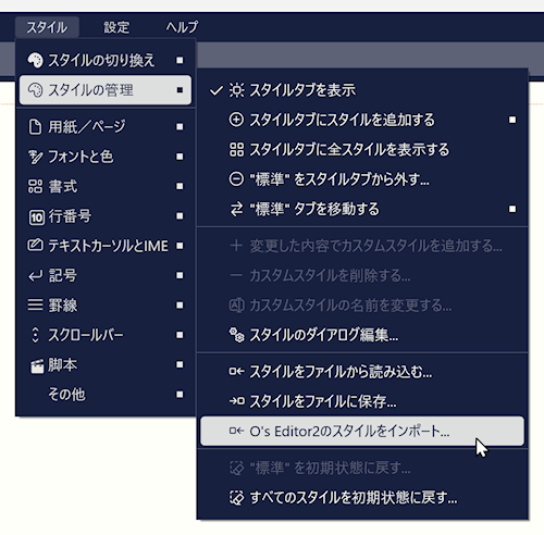 O's Editor3 に移行することができます。メインメニュー[スタイル|スタイルの管理|O's Editor2のスタイルをインポート]を実行するだけです。これだけでカスタマイズしたスタイルを