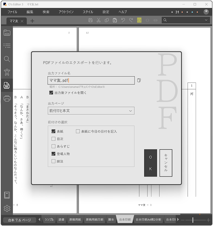 O's Editor2 はPDFを出力するためにCubePDFなどのツールを使用する必要がありましたが、O's Editor3 では標準でPDFエクスポート機能を備えています(※Microsoft