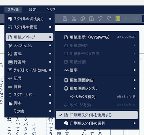 PDFエクスポートする前にあらかじめ印刷用のスタイルを選択しておくことは O's Editor2 と変わらないのですが、メインメニュー[スタイル|用紙/ページ|印刷用スタイルを使用する]にチェックを入れておけば、特定のスタイルで印刷するときに使用する印刷専用スタイルを決めておくこともできます。