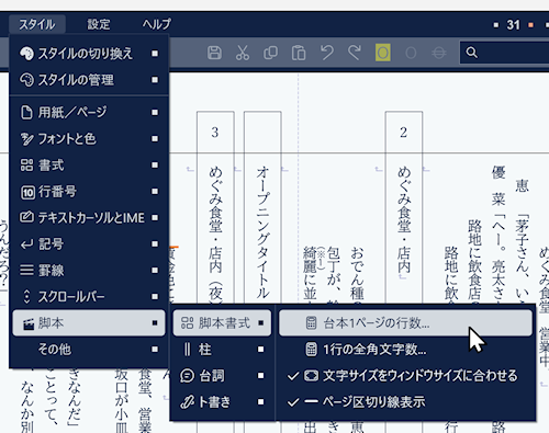 あらかじめ脚本関連のスタイルは装備されていますが、細かく設定したい場合はメインメニューの[スタイル|脚本]にまとめられた脚本設定関連のメニュー項目を利用してください。ここにない項目は設定バーから修正することができます。