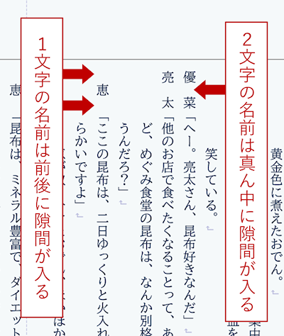このト書きは台詞になってしまうでのしょうか? 実はこれもちゃんとト書きとして判別されます。この場合はカギ括弧のあとにさらに文字が続いているため O's Editor3 はト書きと判断しているのです。こうした実際の映画やドラマの現場で求められる細かな仕様にも対応しています。 台本に印刷するとき、台詞の名前は3文字で整形するのが定番です。この名前3文字整形にも O's Editor3 は対応しています。名前の前後にいちいち空白を挿入する必要はなく、一文字の名前は前後に、二文字の名前はあいだに隙間が入ります。この隙間は空白文字を挿入したのではありません。ですので名前を修正すれば O's Editor3 は自動的に整形をやり直します。名前3文字整形は特に台本入稿の際に大いに役立つはずです。